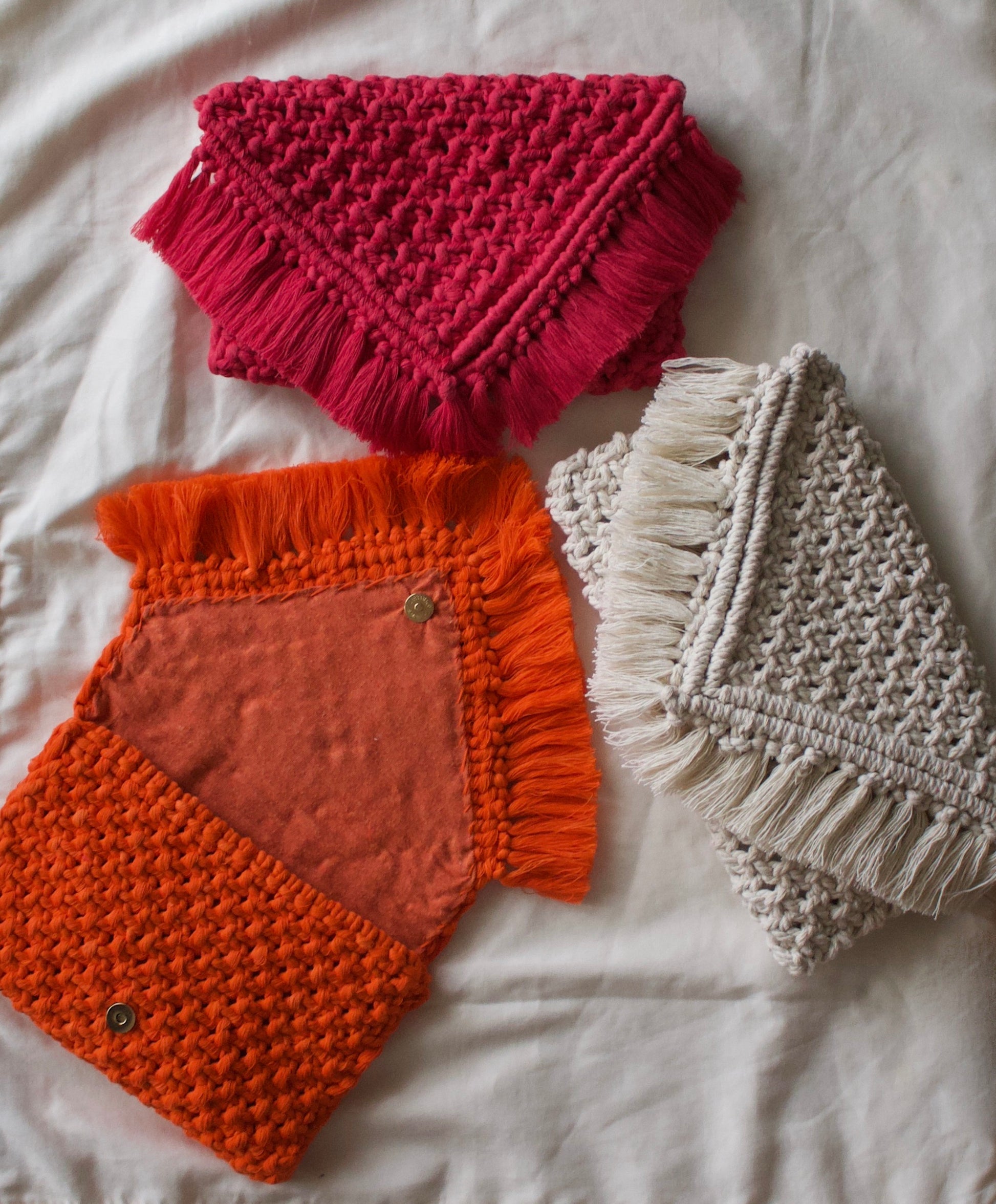 The Anya Macrame Clutch is handmade with cotton macrame cord.