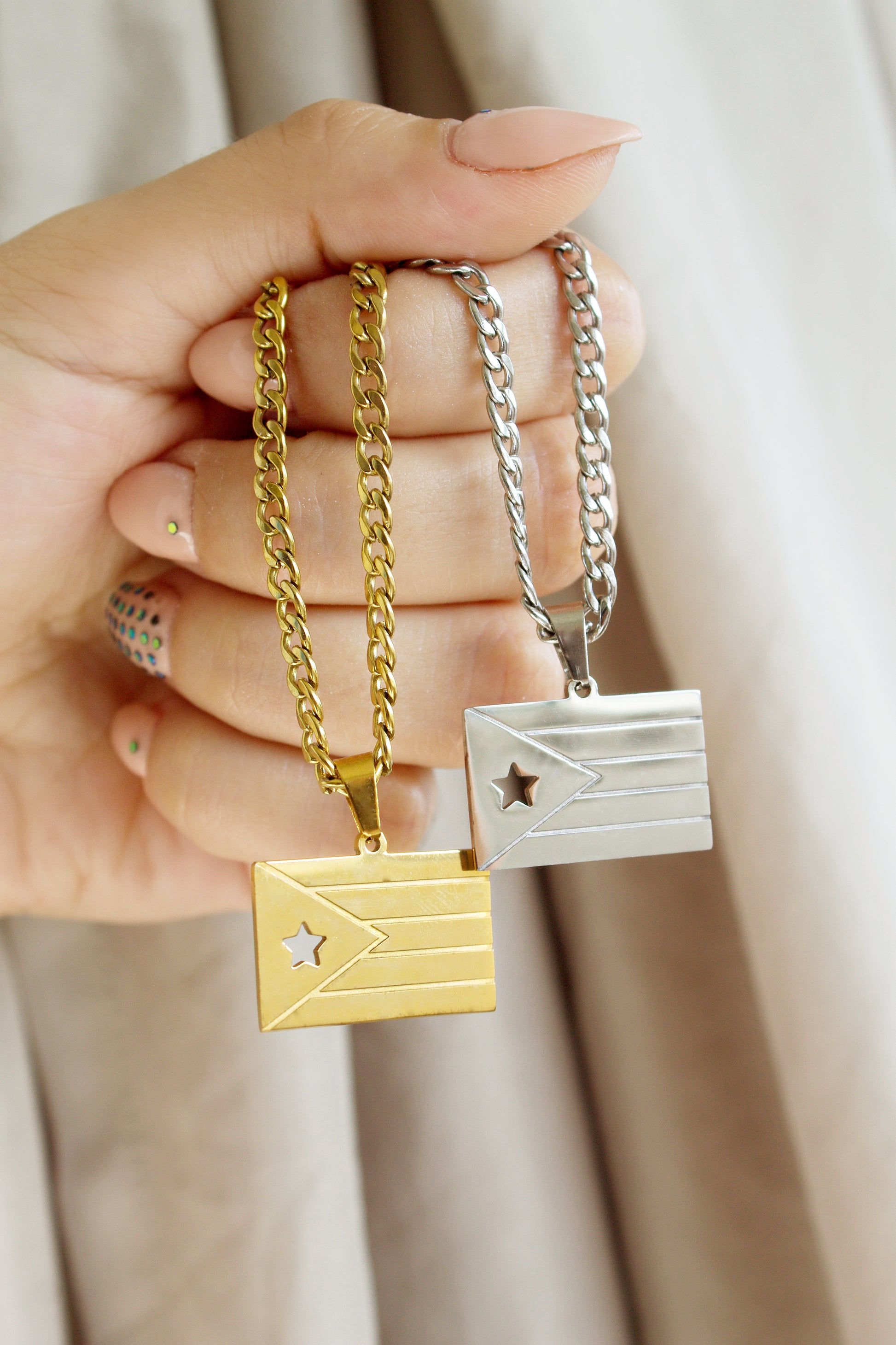 Puertorican flag necklace that is non tarnish and available in two different colors.
